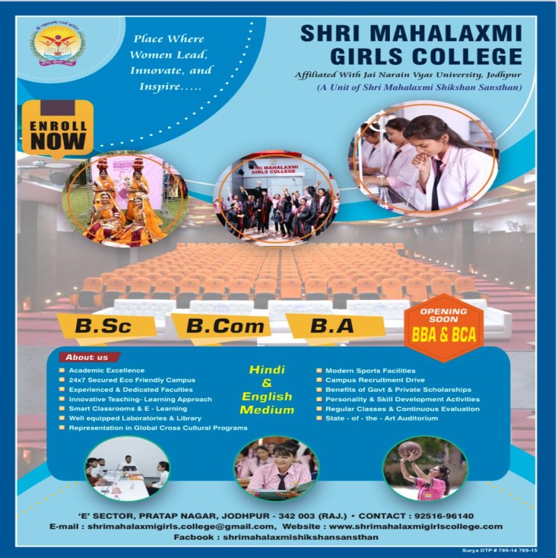 Know moreWelcome to Our College.... Shri Mahalaxmi Girls College was established by Shri Mahalaxmi Sikshan Sansthan, Jodhpur in the year 2010 and affiliated to Jai Narayan Vyas University, Jodhpur. The campus has safe and secured atmosphere for the girls. Facilities on the campus meet their needs for extra curricular activities and interactions. Our motive is to provide high quality education with low fees structure. We aim to evaluate our students on the basis of their physical, mental, social, emotional and intellectual development. "The best way to predict future is to create it..." We are creating the FUTURE.…